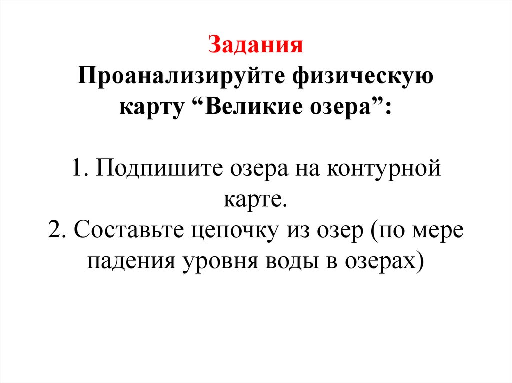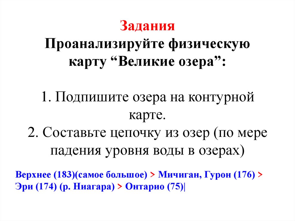 40. Задания Проанализируйте физическую карту “Великие озера”: 1. Подпишите озера на контурной карте. 2. Составьте цепочку из озер