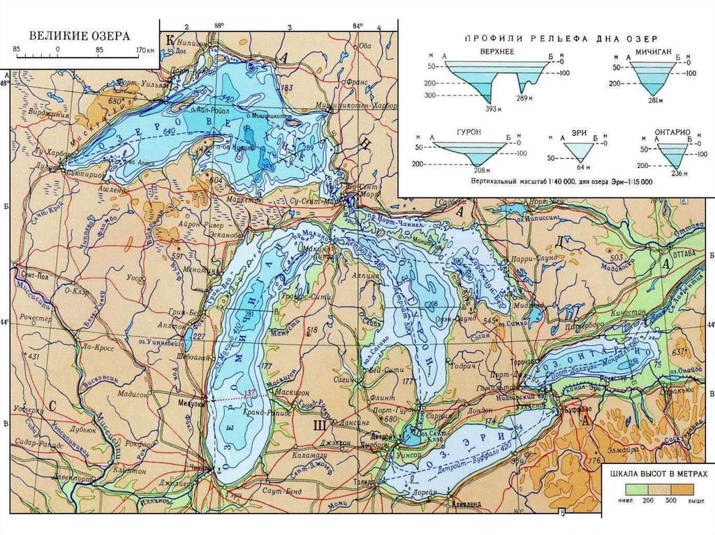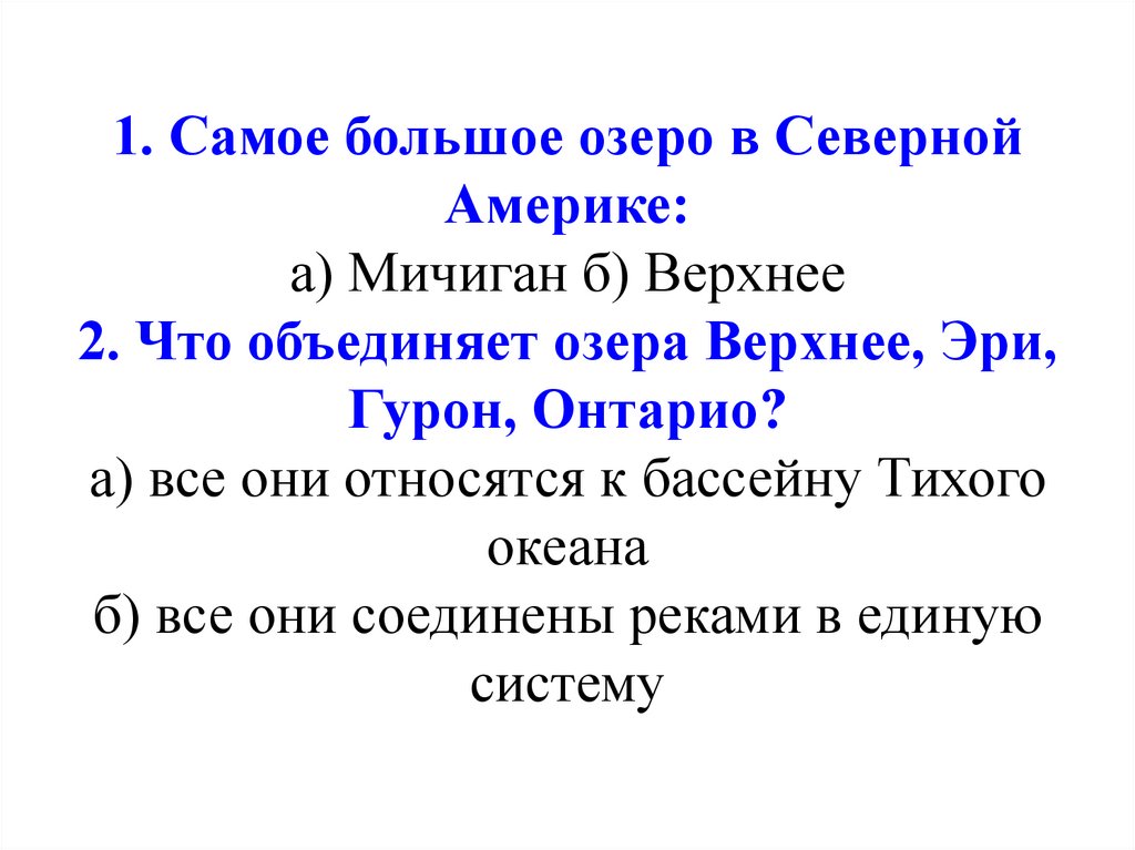 карту.46. 1. Самое большое озеро в Северной Америке: а) Мичиган б) Верхнее 2. Что объединяет озера Верхнее, Эри, Гурон, Онтарио? а) все