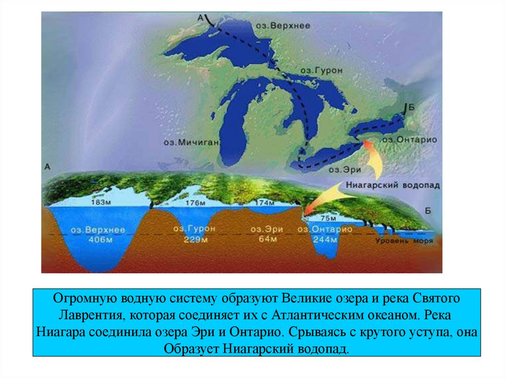 Огромную водную систему образуют Великие озера и река СвятогоЛаврентия, которая соединяет их с Атлантическим океаном. Река