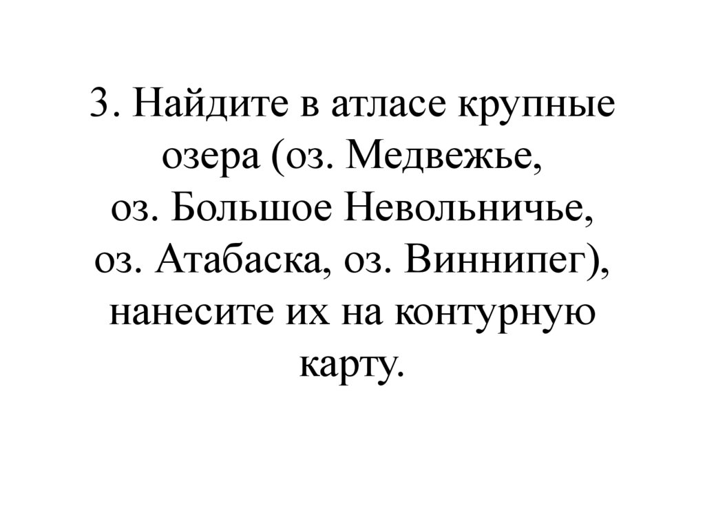 45. 3. Найдите в атласе крупные озера (оз. Медвежье, оз. Большое Невольничье, оз. Атабаска, оз. Виннипег), нанесите их на контурную