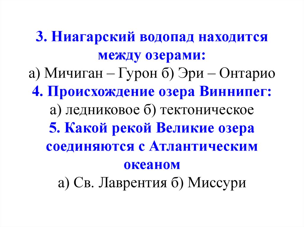 47. 3. Ниагарский водопад находится между озерами: а) Мичиган – Гурон б) Эри – Онтарио 4. Происхождение озера Виннипег: а)
