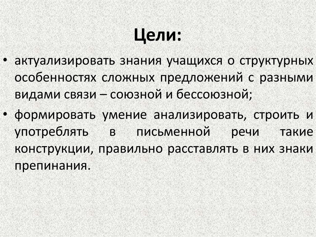 • актуализировать знания учащихся о структурныхособенностях сложных предложений с разными