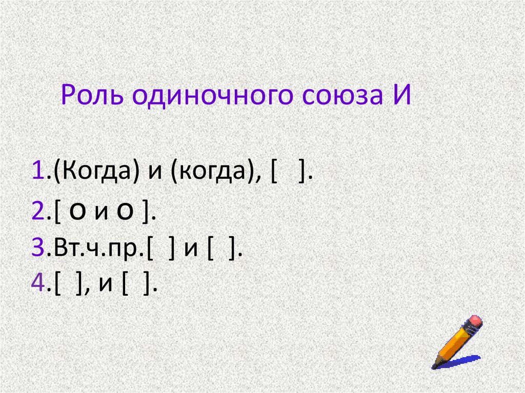9. Роль одиночного союза И 1.(Когда) и (когда), [ ]. 2.[ o и o ]. 3.Вт.ч.пр.[ ] и [ ]. 4.[ ], и [ ].