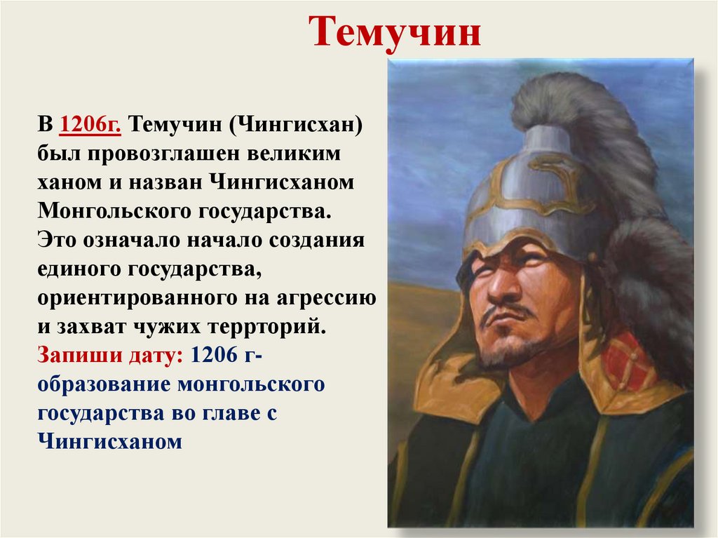 В 1206г. Темучин (Чингисхан)был провозглашен великим