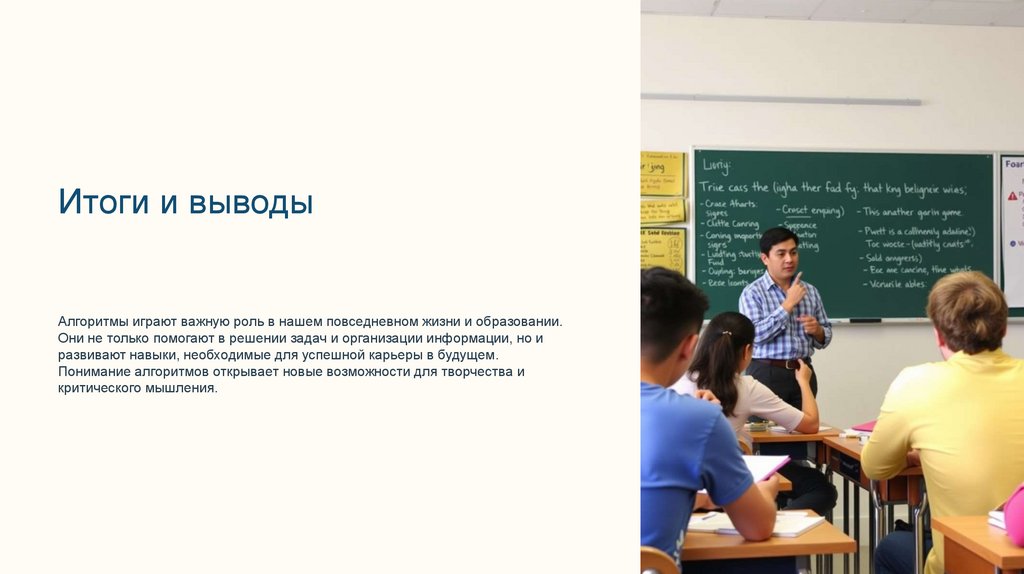 Итоги и выводыАлгоритмы играют важную роль в нашем повседневном жизни и образовании.