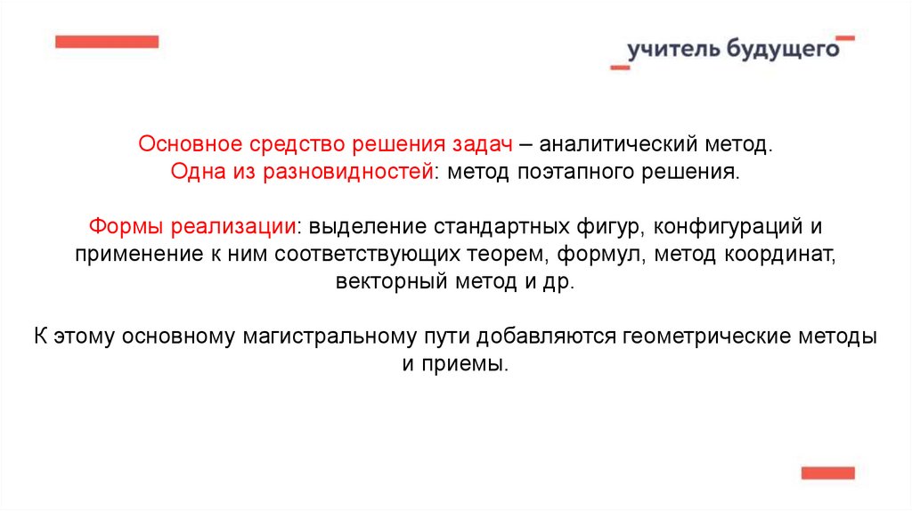 Основное средство решения задач – аналитический метод.Одна из разновидностей: метод поэтапного решения.