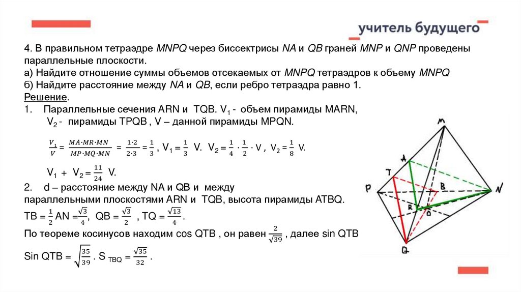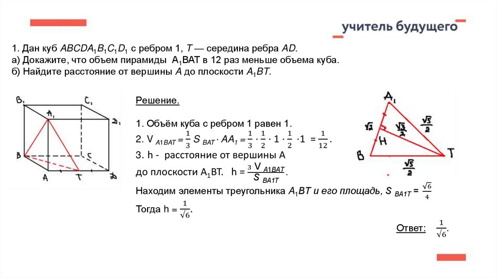 1. Дан куб ABCDA1B1C1D1 с ребром 1, T — середина ребра AD.а) Докажите, что объем пирамиды А1ВАТ в 12 раз меньше объема куба.