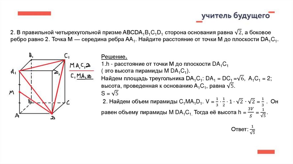 2. В правильной четырехугольной призме ABCDA1B1C1D1 сторона основания равна 2, а боковоеребро равно 2. Точка M — середина ребра AA1. Найдите расстояние от точки M до плоскости DA1C1.