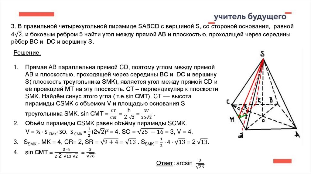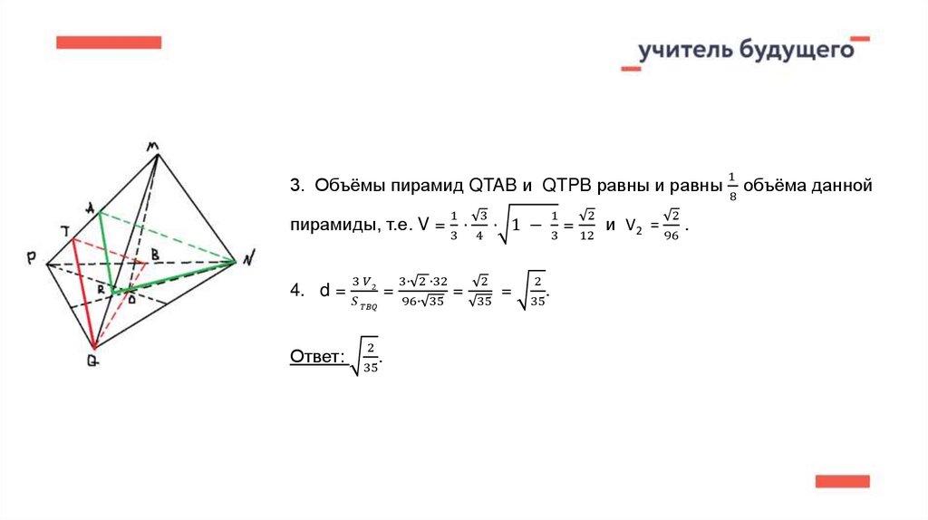 2. Найдем объем пирамиды C1MA1D1. V = · · 1 · 2 · 2 = . Он