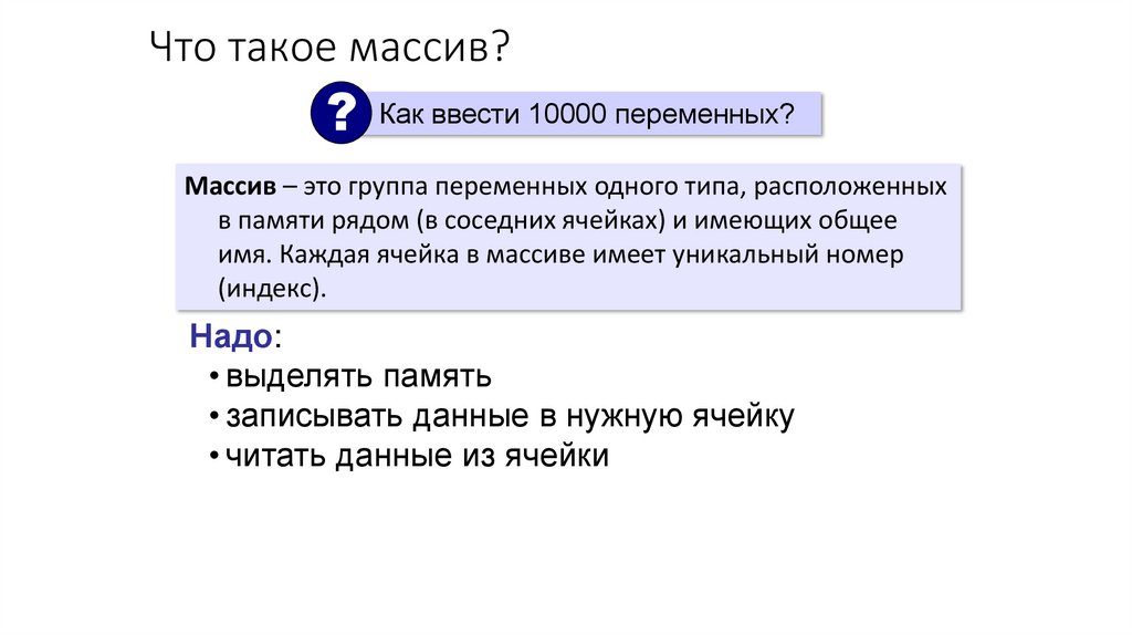? Как ввести 10000 переменных?Массив – это группа переменных одного типа, расположенных