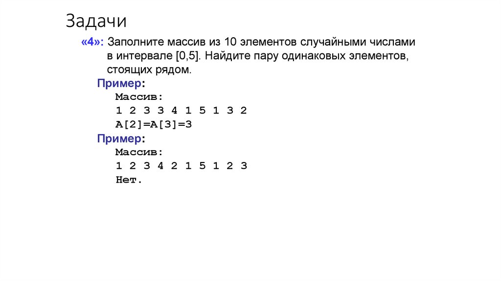 «4»: Заполните массив из 10 элементов случайными числамив интервале [0,5]. Найдите пару одинаковых элементов,