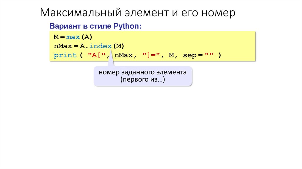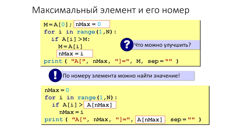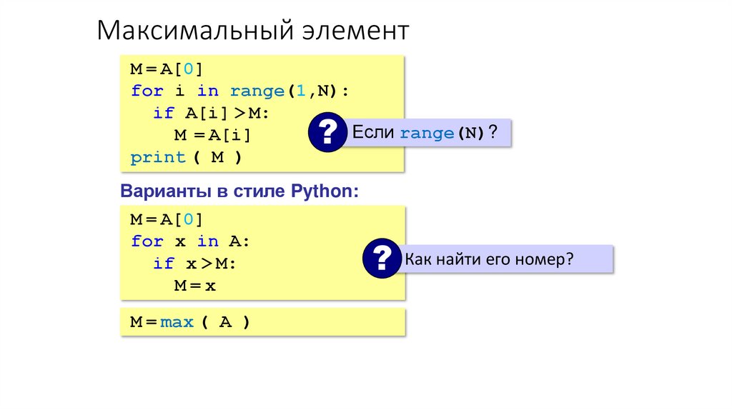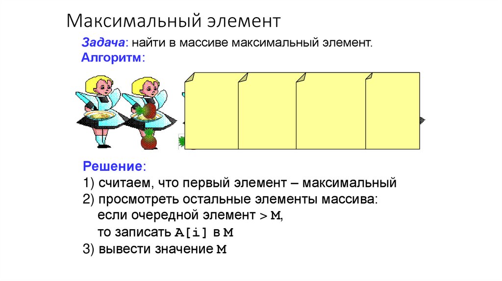 Максимальный элементЗадача: найти в массиве максимальный элемент.