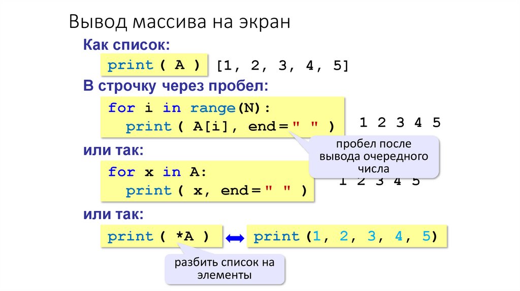 Как список:print ( A ) [1, 2, 3, 4, 5]