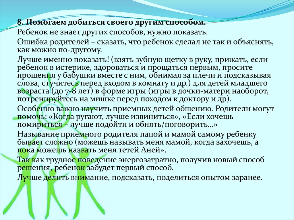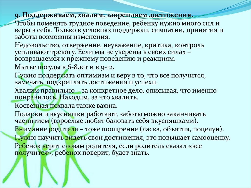 9. Поддерживаем, хвалим, закрепляем достижения.Чтобы поменять трудное поведение, ребенку нужно много сил и