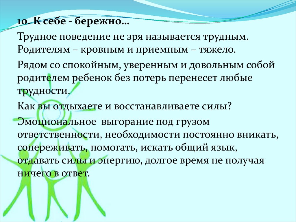 10. К себе - бережно…Трудное поведение не зря называется трудным.