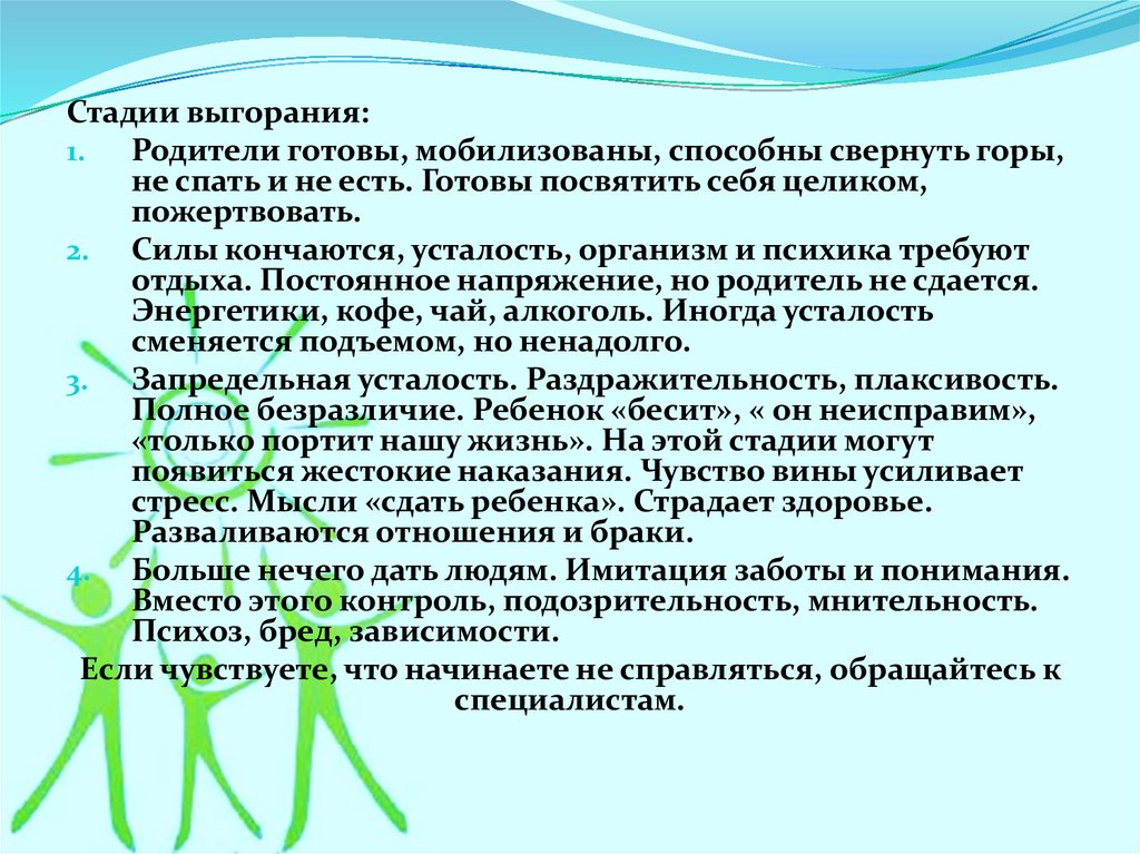 Стадии выгорания:1. Родители готовы, мобилизованы, способны свернуть горы,