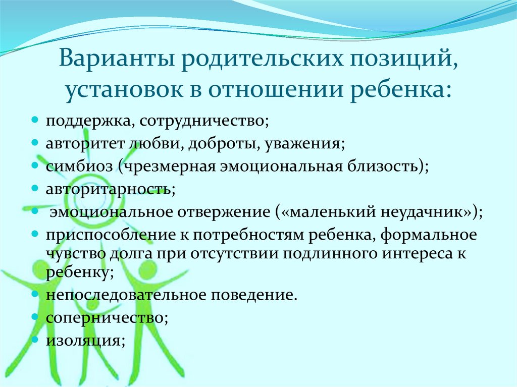 Упражнение «Архитекторстроитель»4. Варианты родительских позиций, установок в отношении ребенка: