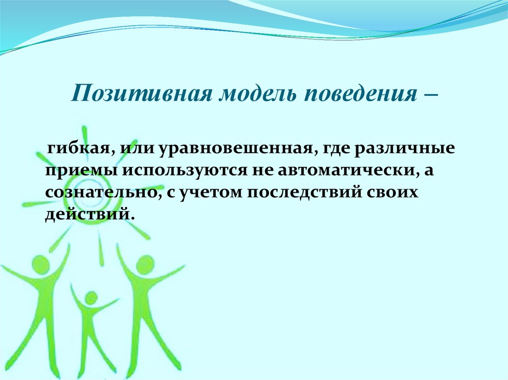 6. Позитивная модель поведения -гибкая, или уравновешенная, где различные приемы используются не автоматически, а сознательно, с
