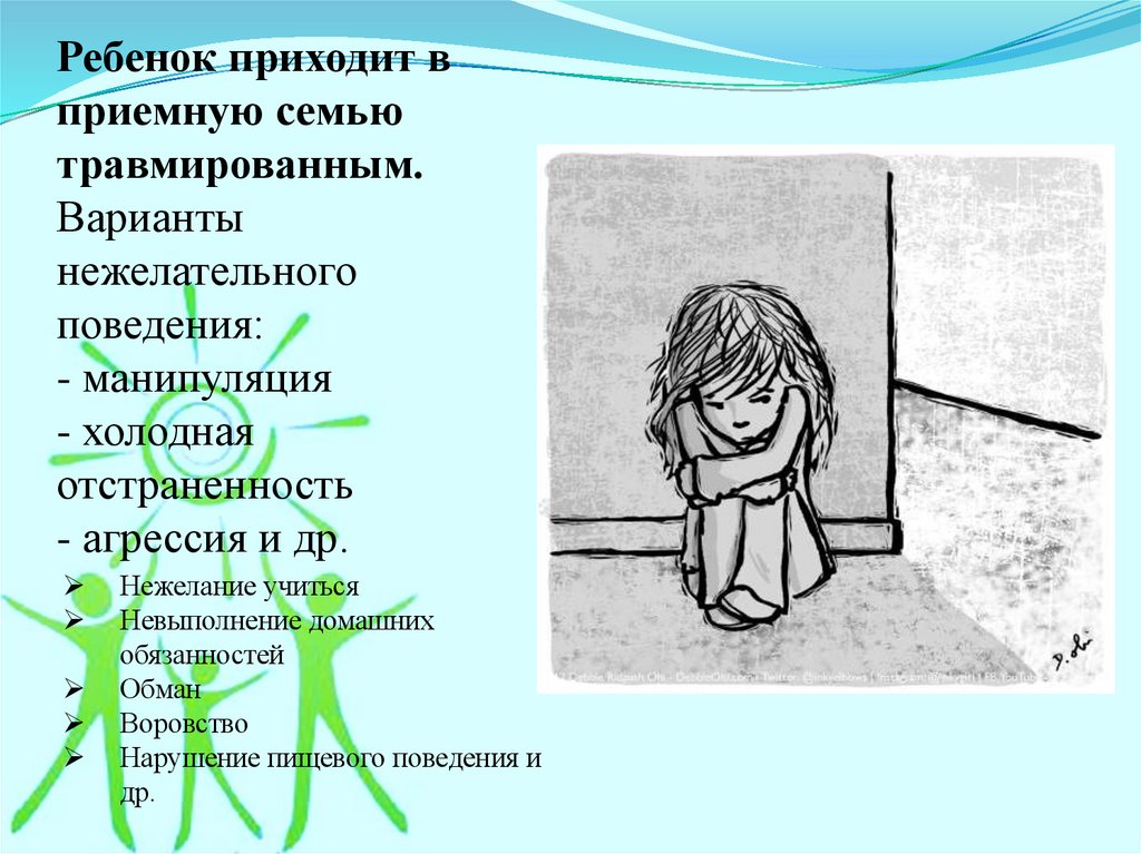 5. Ребенок приходит в приемную семью травмированным. Варианты нежелательного поведения: - манипуляция - холодная отстраненность -