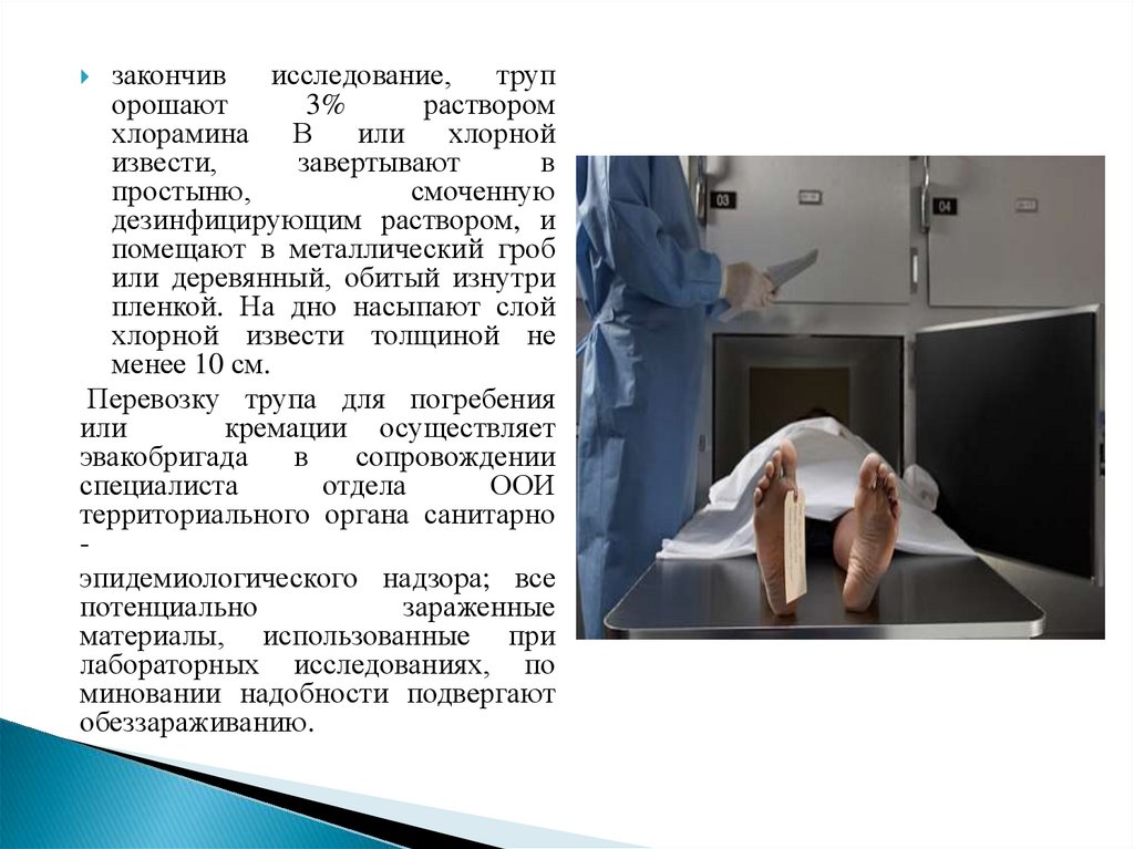 После вскрытия умерших от ООИ дезинфекцию морга производят силами исредствами