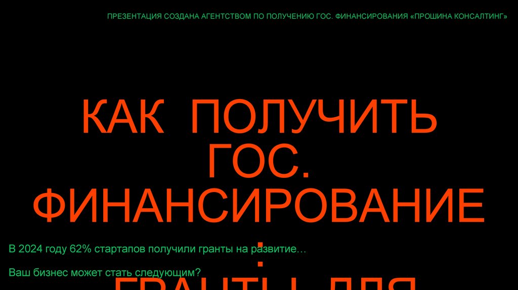 ПРЕЗЕНТАЦИЯ СОЗДАНА АГЕНТСТВОМ ПО ПОЛУЧЕНИЮ ГОС. ФИНАНСИРОВАНИЯ «ПРОШИНА КОНСАЛТИНГ»КАК ПОЛУЧИТЬ