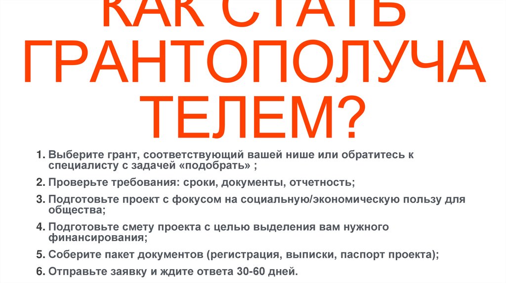 1. Выберите грант, соответствующий вашей нише или обратитесь кспециалисту с задачей «подобрать» ;