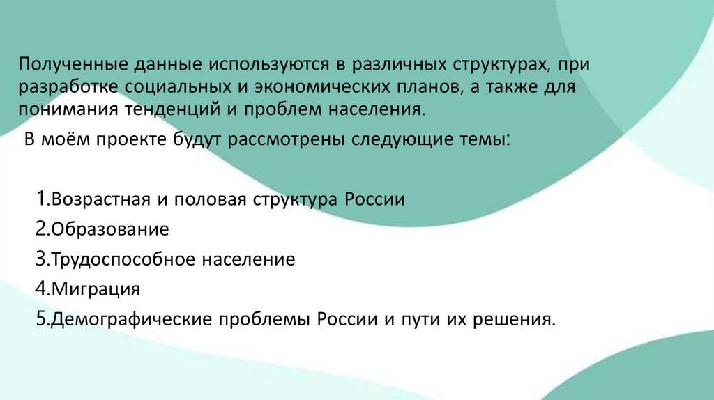Полученные данные используются в различных структурах, приразработке социальных и экономических планов, а также для
