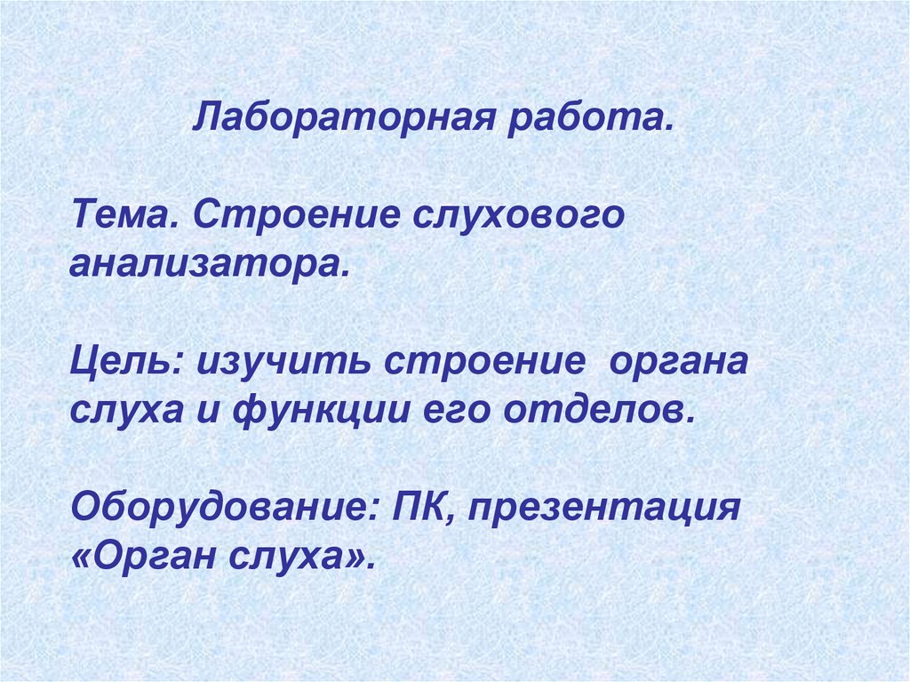 1. Лабораторная работа. Тема. Строение слухового анализатора. Цель: изучить строение органа слуха и функции его отделов.