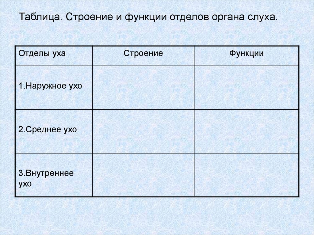 Таблица. Строение и функции отделов органа слуха.Отделы уха