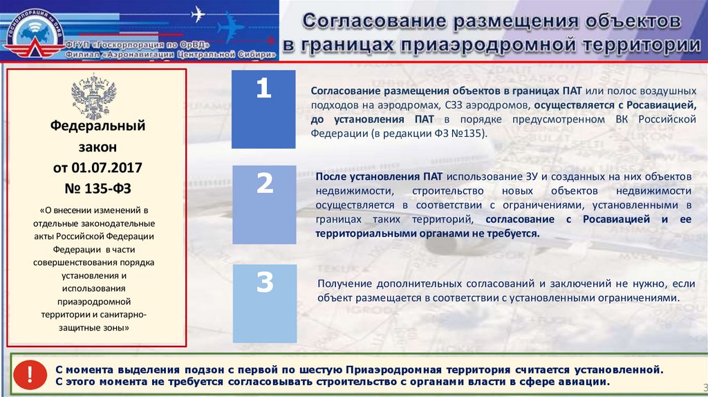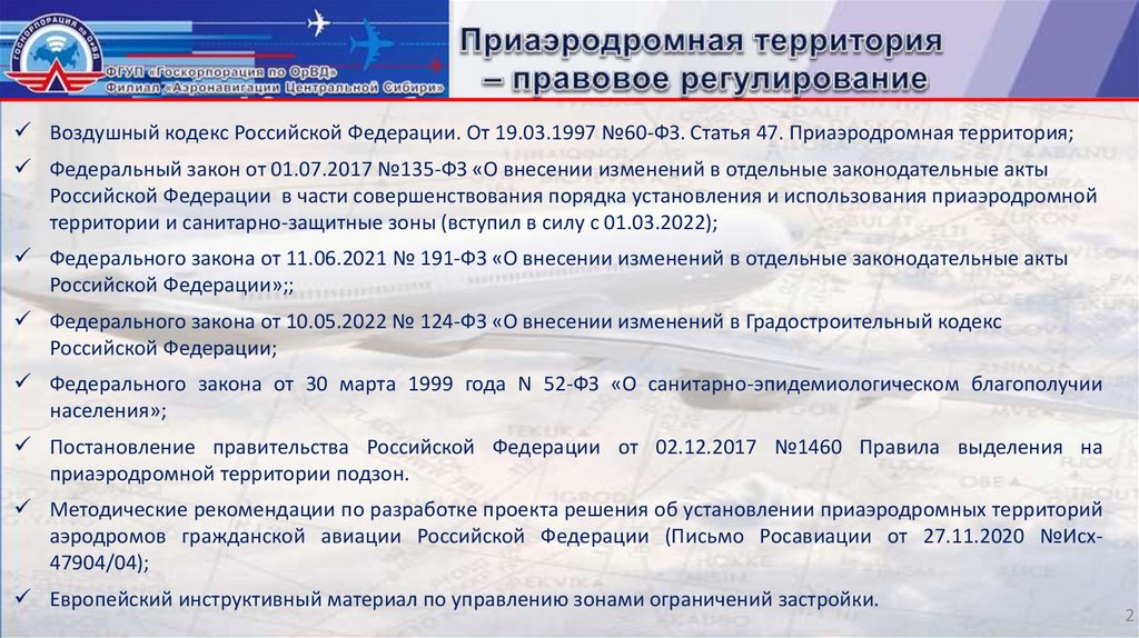 Воздушный кодекс Российской Федерации. От 19.03.1997 №60-ФЗ. Статья 47. Приаэродромная территория;Федеральный закон от 01.07.2017 №135-ФЗ «О внесении изменений в отдельные законодательные акты