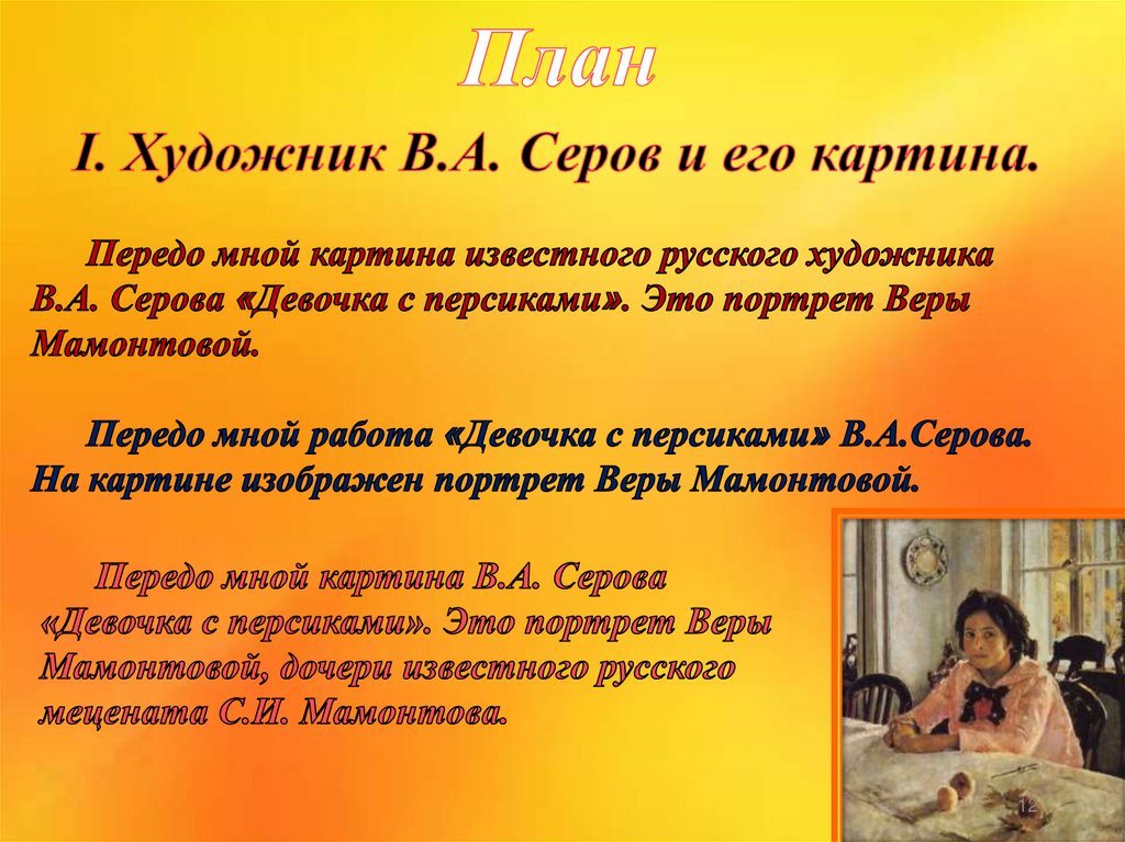 Примерный план сочинения. Валентин Серов «Девочка с персиками». Василий Тропинин «Девочка с куклой»