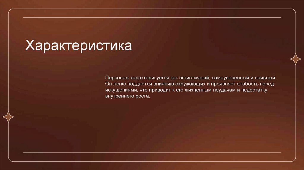 ХарактеристикаПерсонаж характеризуется как эгоистичный, самоуверенный и наивный.