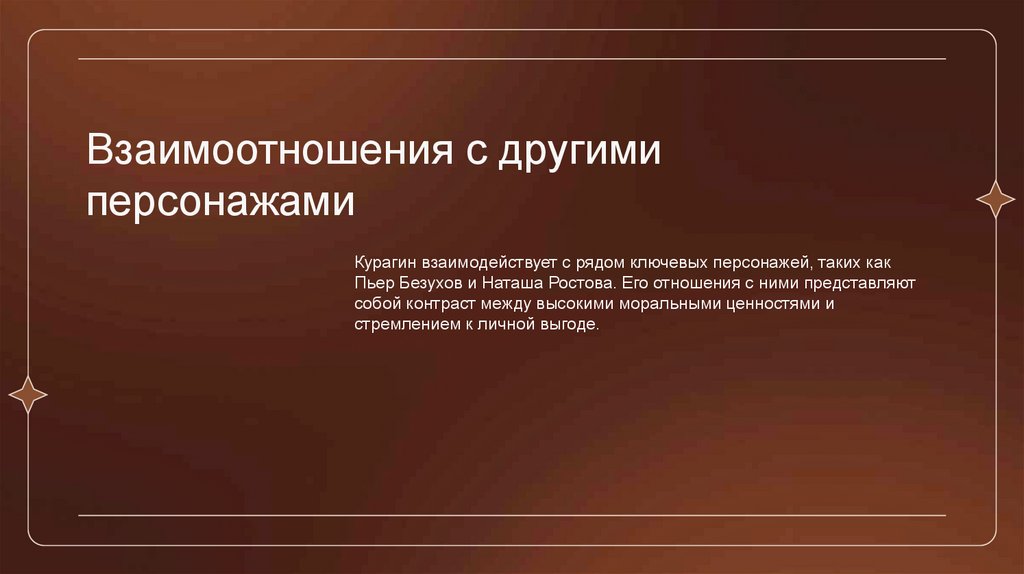 Курагин взаимодействует с рядом ключевых персонажей, таких как