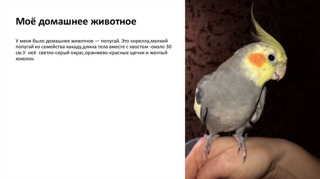 Моё домашнее животноеУ меня было домашнее животное — попугай. Это корелла,мелкий