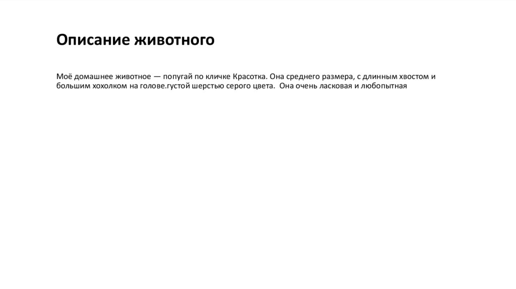Описание животногоМоё домашнее животное — попугай по кличке Красотка. Она среднего размера, с длинным хвостом и