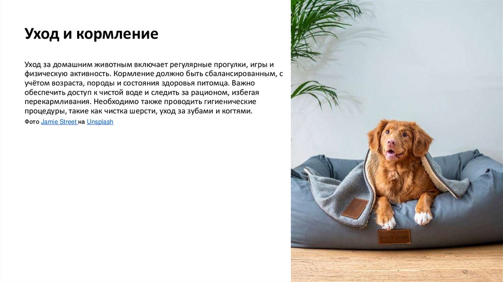 Уход и кормлениеУход за домашним животным включает регулярные прогулки, игры и