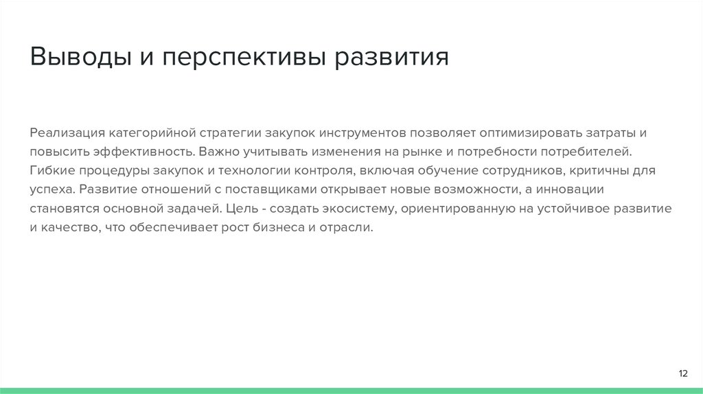 Выводы и перспективы развитияРеализация категорийной стратегии закупок инструментов позволяет оптимизировать затраты и