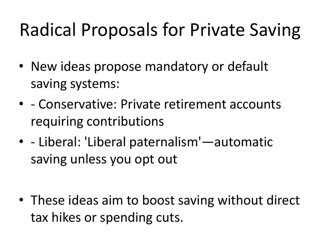 Radical Proposals for Private Saving• New ideas propose mandatory or default