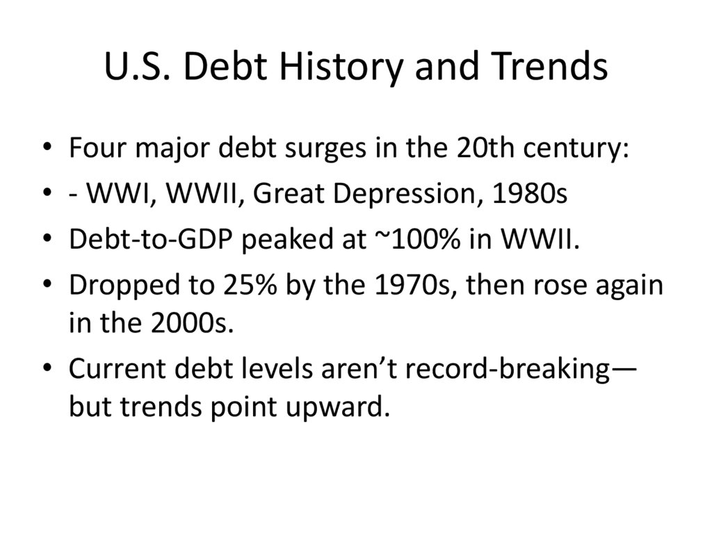 • Debt-to-GDP peaked at ~100% in WWII.