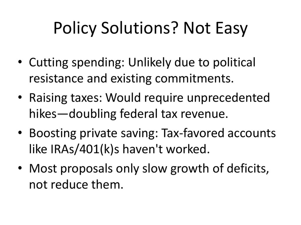 Policy Solutions? Not Easy• Cutting spending: Unlikely due to political