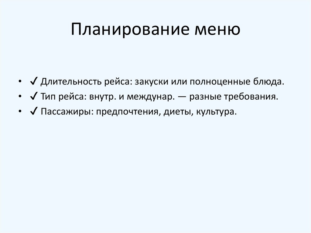 Планирование меню• ✔ Длительность рейса: закуски или полноценные блюда.