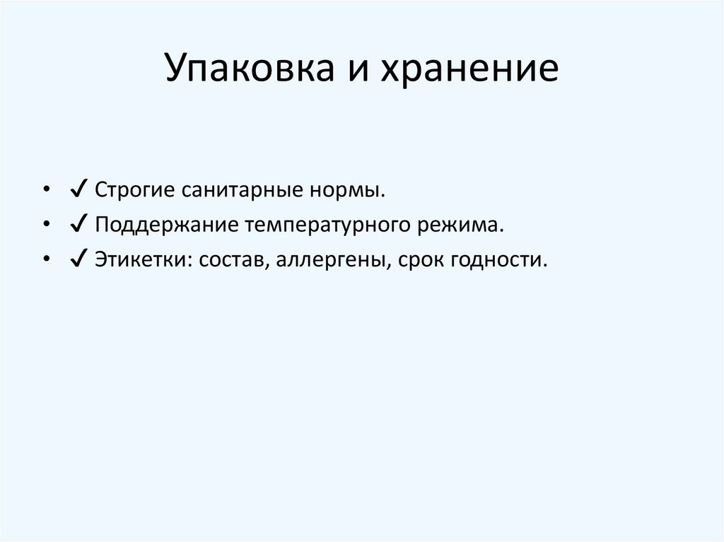 Упаковка и хранение• ✔ Строгие санитарные нормы.