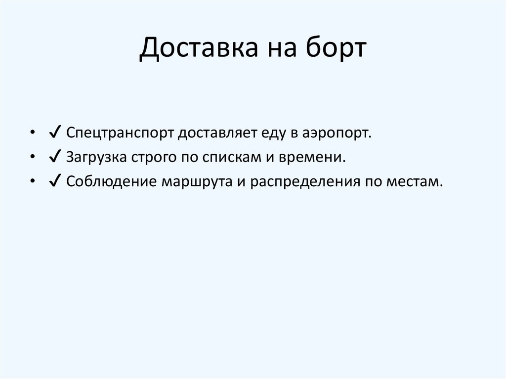 Доставка на борт• ✔ Спецтранспорт доставляет еду в аэропорт.