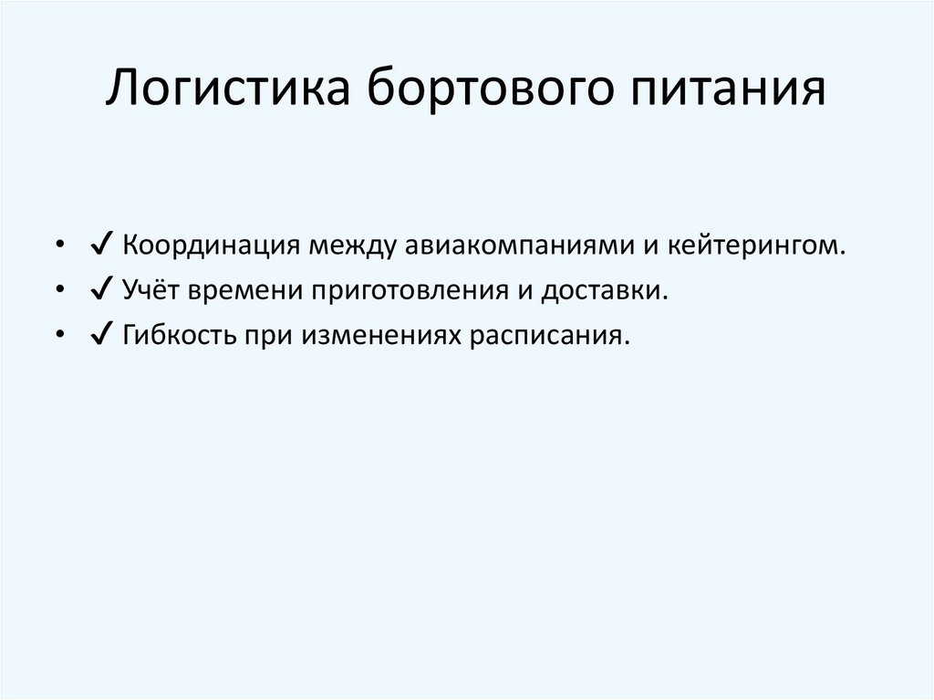 Логистика бортового питания• ✔ Координация между авиакомпаниями и кейтерингом.