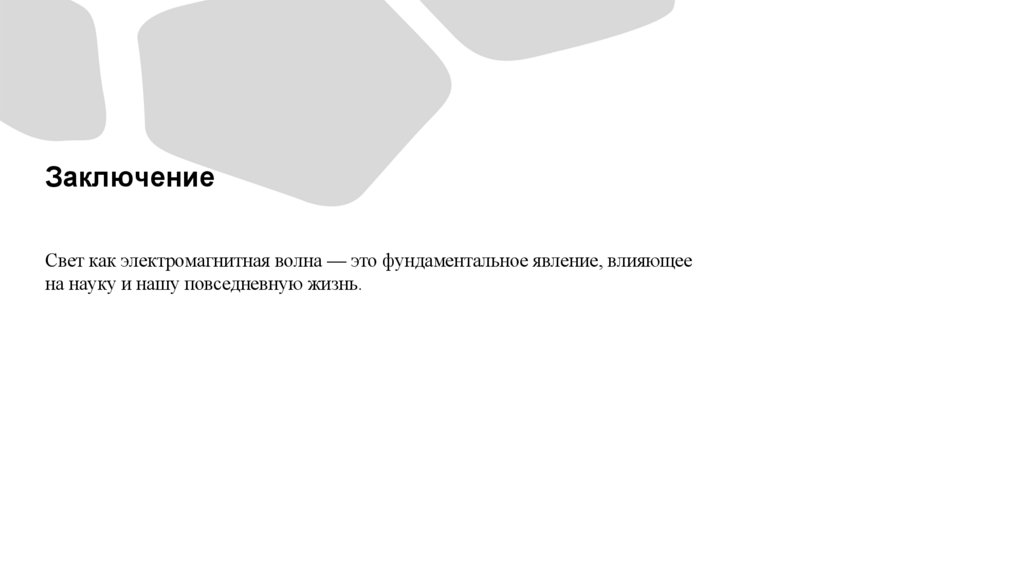 ЗаключениеСвет как электромагнитная волна — это фундаментальное явление, влияющее