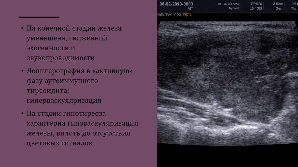 • При АИТ железа диффузно увеличена,