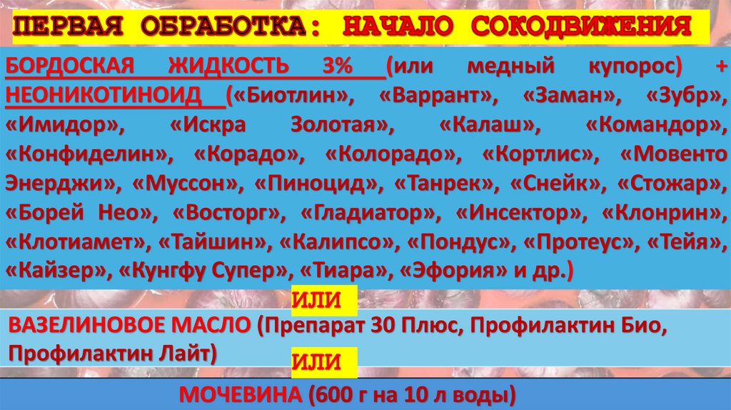 БОРДОСКАЯ ЖИДКОСТЬ 3% (или медный купорос) +НЕОНИКОТИНОИД («Биотлин», «Варрант», «Заман», «Зубр»,