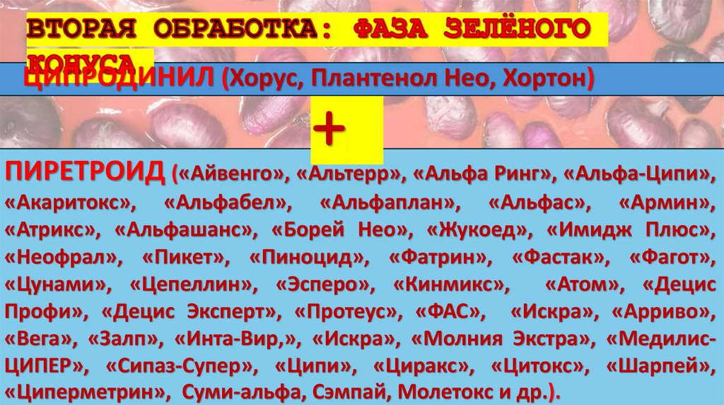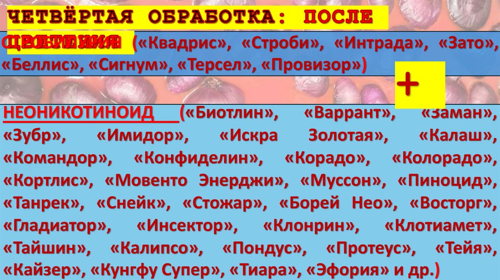 ИМИДАКЛОПРИДА (Командор, Зубр, Калаш, Танрек и др.). Цель – уничтожение трипса и ряда