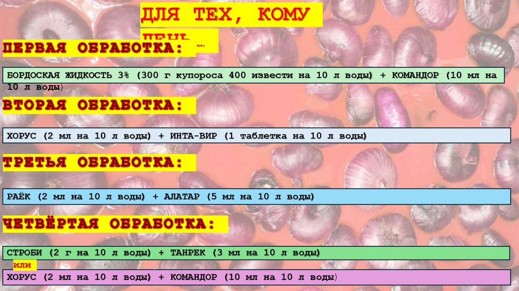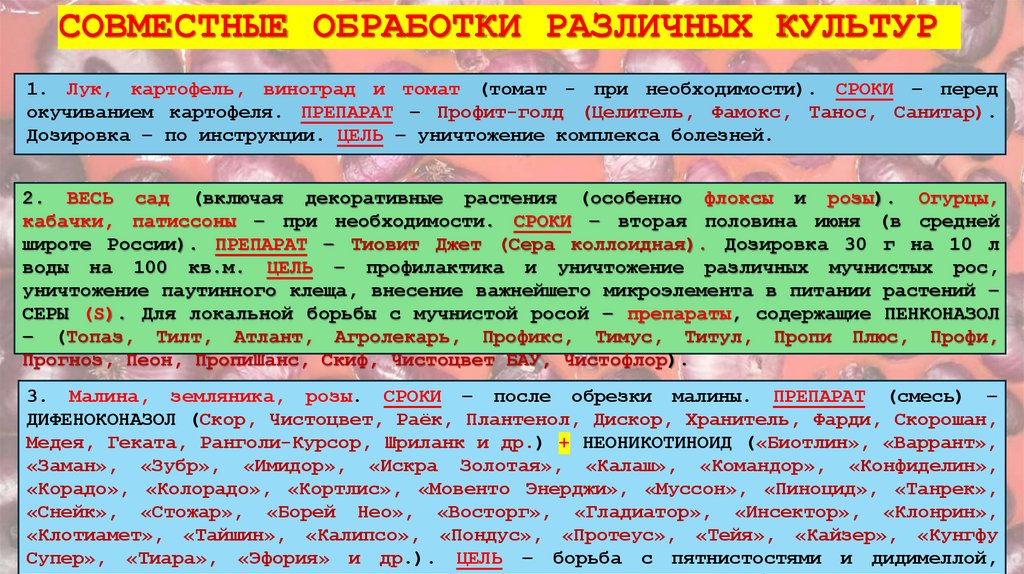 СОВМЕСТНЫЕ ОБРАБОТКИ РАЗЛИЧНЫХ КУЛЬТУР1. Лук, картофель, виноград и томат (томат - при необходимости). СРОКИ – перед