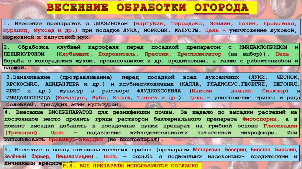 1. Внесение препаратов с ДИАЗИНОНом (Баргузин, Террадокс, Землин, Почин, Провотокс,Мурацид, Мухоед и др.) при посадке ЛУКА, МОРКОВИ, КАПУСТЫ. Цель – уничтожение луковой,